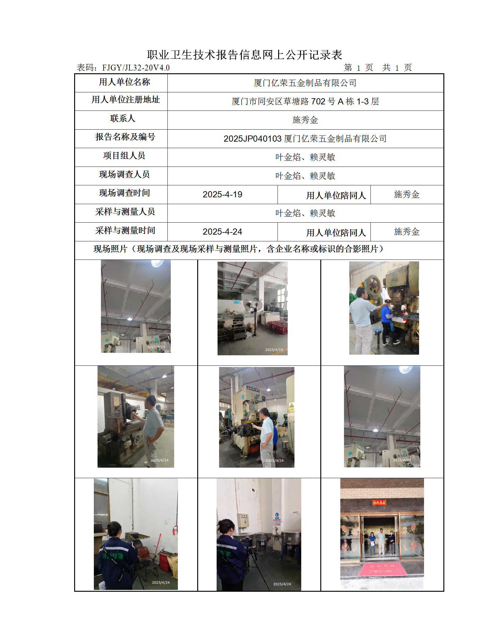 廈門億榮五金制品有限公司-2025年工作場(chǎng)所職業(yè)病危害因素檢測(cè)