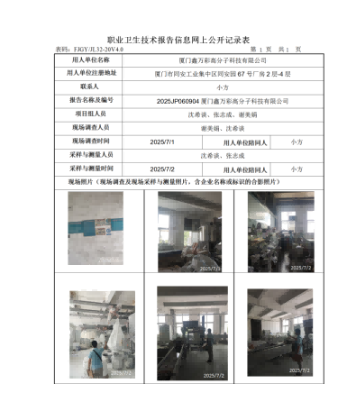 廈門鑫萬彩高分子科技有限公司-2025年工作場所職業(yè)病危害因素檢測