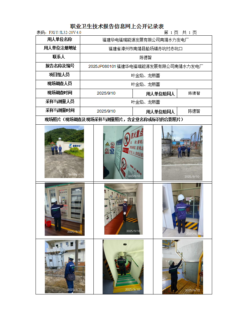 福建華電福瑞能源發(fā)展有限公司南靖水力發(fā)電廠-2025年工作場(chǎng)所職業(yè)病危害因素檢測(cè)